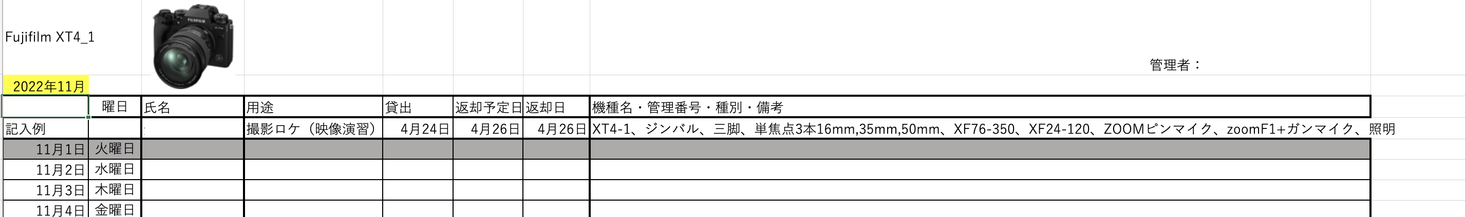 | 申請日 | 開始日 | 終了日 | 学籍番号 | 氏名 | 用途 | 機種名 | 備考 |